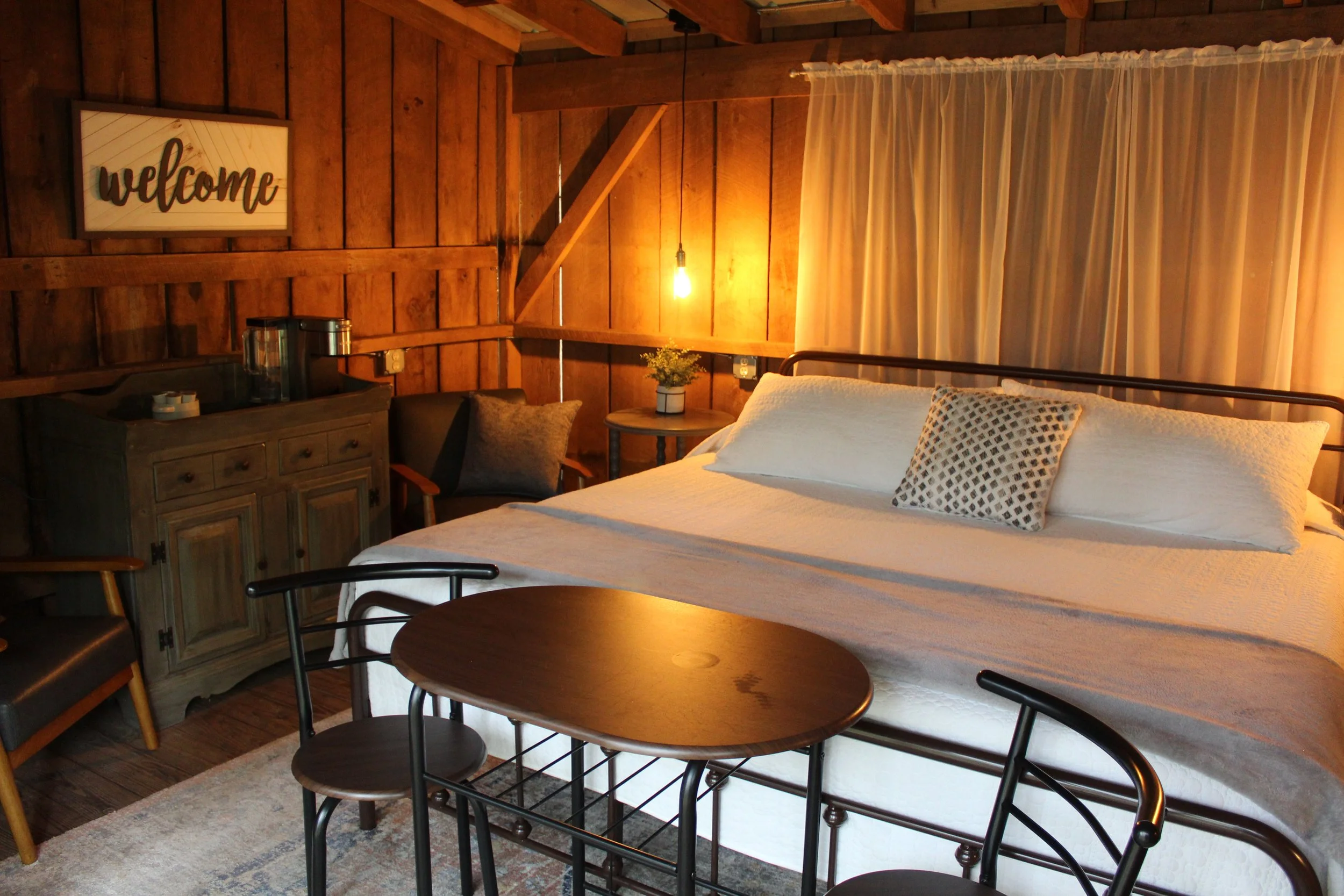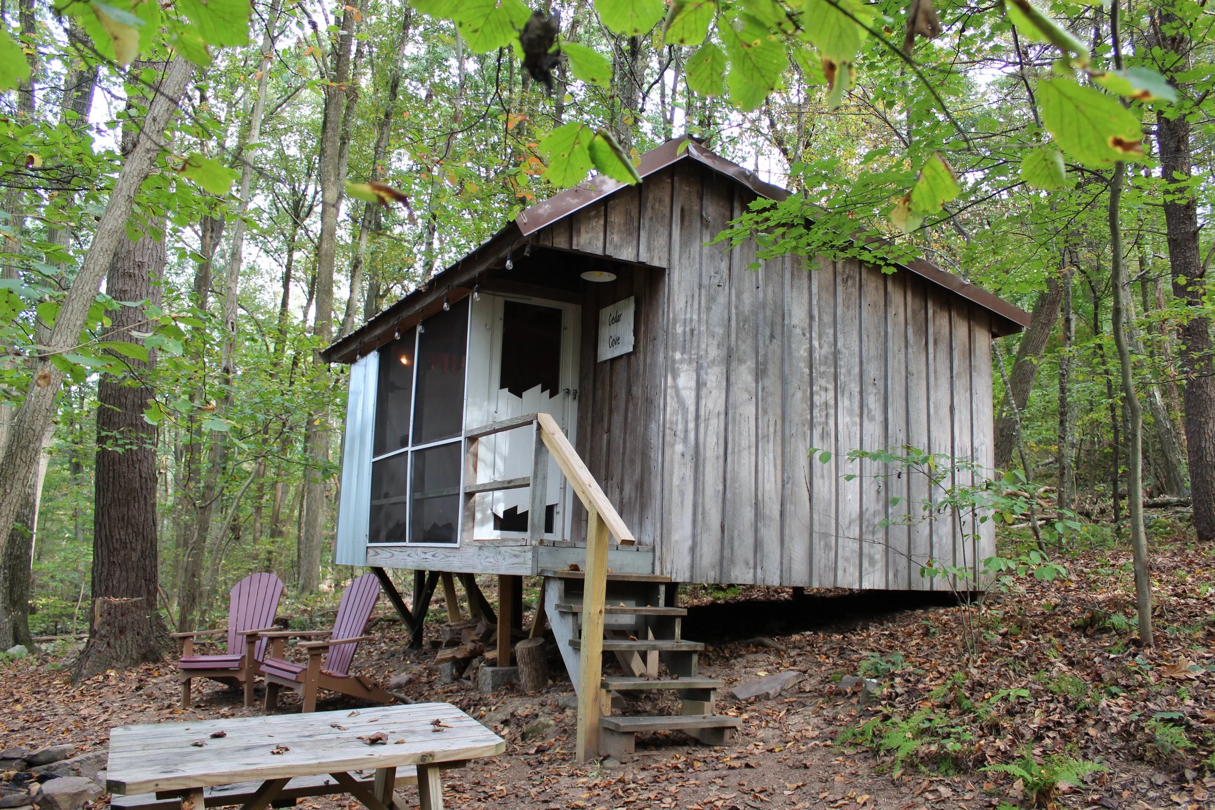 Nestled in a beautiful forest on the side of Peter's Mountain, these secluded glamping sites are ready to welcome you for a refreshing stay. Sites include beds and a small seating area with an area rug and a ceiling fan. Bedding is provided along with a Keurig machine stocked with pods to brew your favorite hot beverage. Two Adirondack chairs allow you to relax around your personal fire ring, equipped with a grate for cooking over the open fire. Enjoy dinner, games, and laughter around the outdoor picnic table.